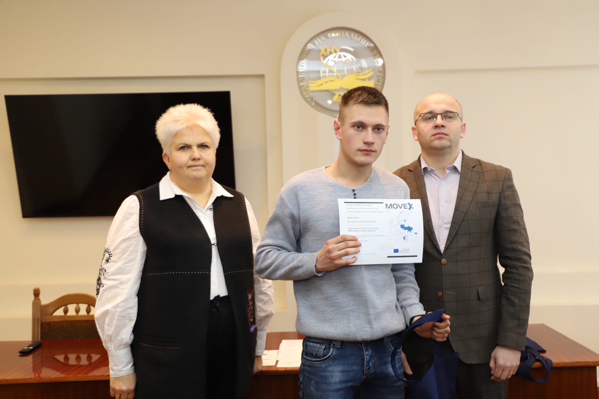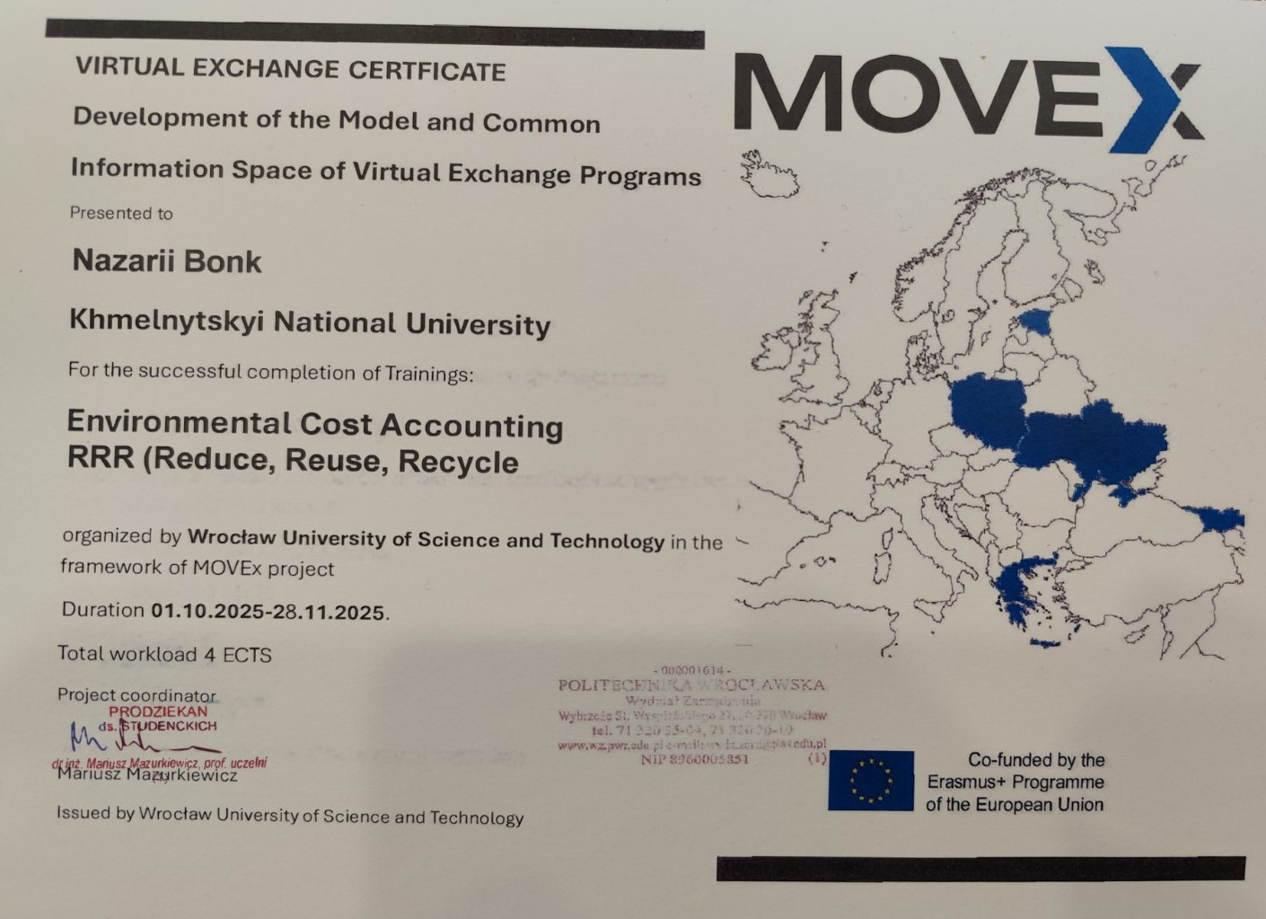 22 грудня 2025 року відбулось урочисте вручення сертифікатів студентам Хмельницького національного університету, які успішно пройшли програму віртуальних академічних обмінів в рамках міжнародного проєкту Erasmus+ MOVEx. З вітальними словами до студентів звернувся ректор ХНУ Сергій Матюх. Сергій Анатолійович привітав студентів із важливим здобутком, наголосивши на значенні цифрової трансформації освіти:Проєкт MOVEx став для вас містком до європейських освітніх стандартів. Отримані сертифікати – це підтвердження того, що Хмельницький національний університет інтегрований у світовий науковий простір, а студенти – конкурентоспроможні та відкриті до інновацій. Від кафедри ТАМ сертифікат отримав студент гр. АТ-23 Бонк Назар (ОП Автомобільний транспорт).
